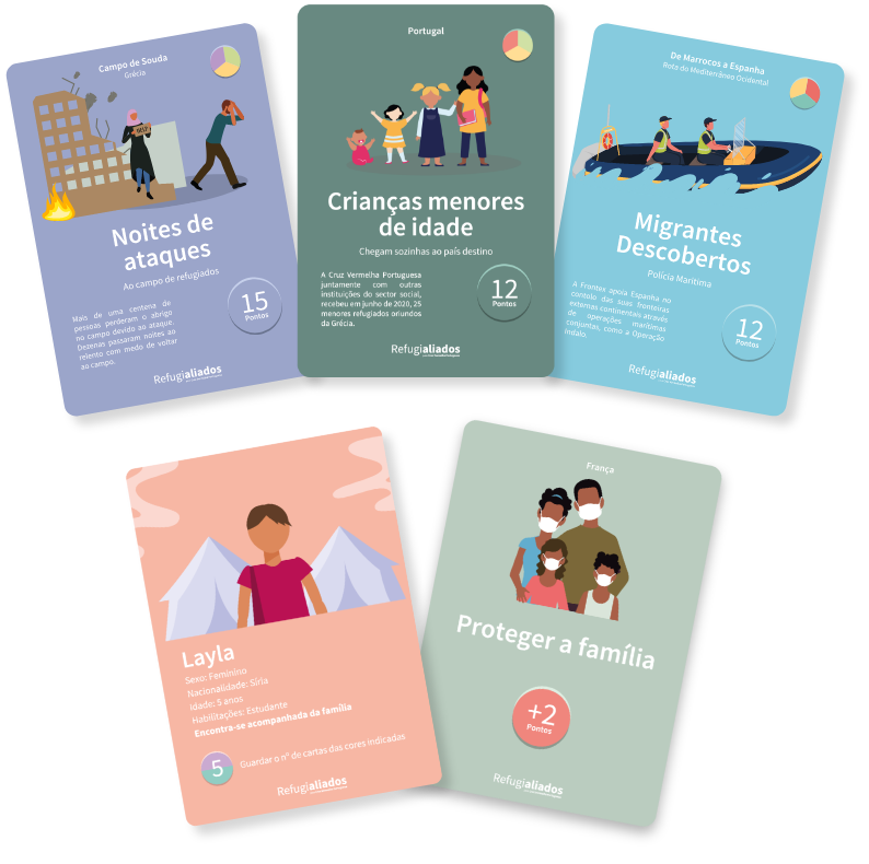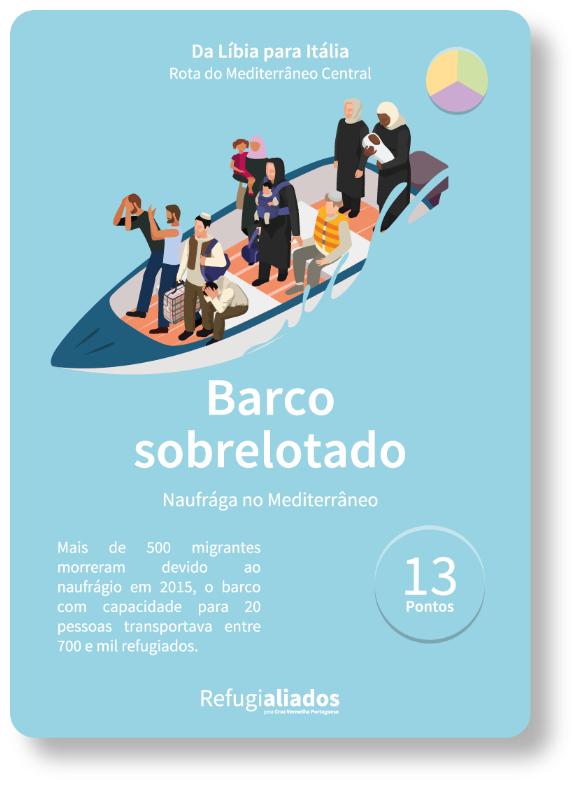 Um jogo inteiramente formado por cartas, composto por cartas desafio, cartas perfil e cartas objeto. Existem 3 níveis de cartas desafio, a travessia, a permanência no campo de refugiados e a integração de novo na sociedade. Para ultrapassar os desafios, cada jogador terá de colaborar com os outros jogadores, simulando a vida em comunidade de cada um de nós. E terá também de cumprir os seus objetivos pessoais.